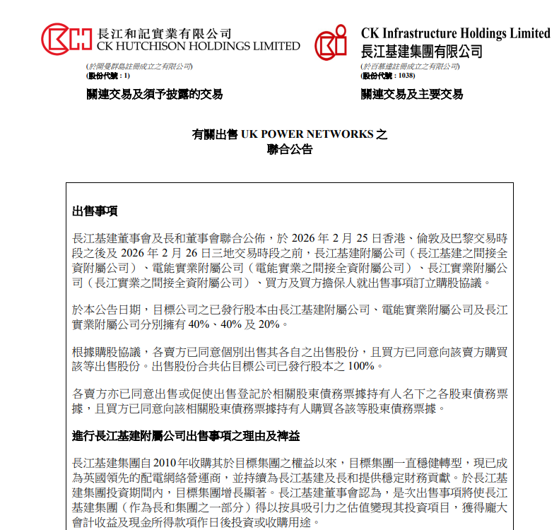 【大河财立方消息】2月26日早间,长和在港交所公告,旗下长江基建集团、电能实业及长实集团分别作价443亿港元、443亿港元及221.5亿港元向法国公用事业企业Engie出售持有UK Power Networks的40%、40%及20%权益。