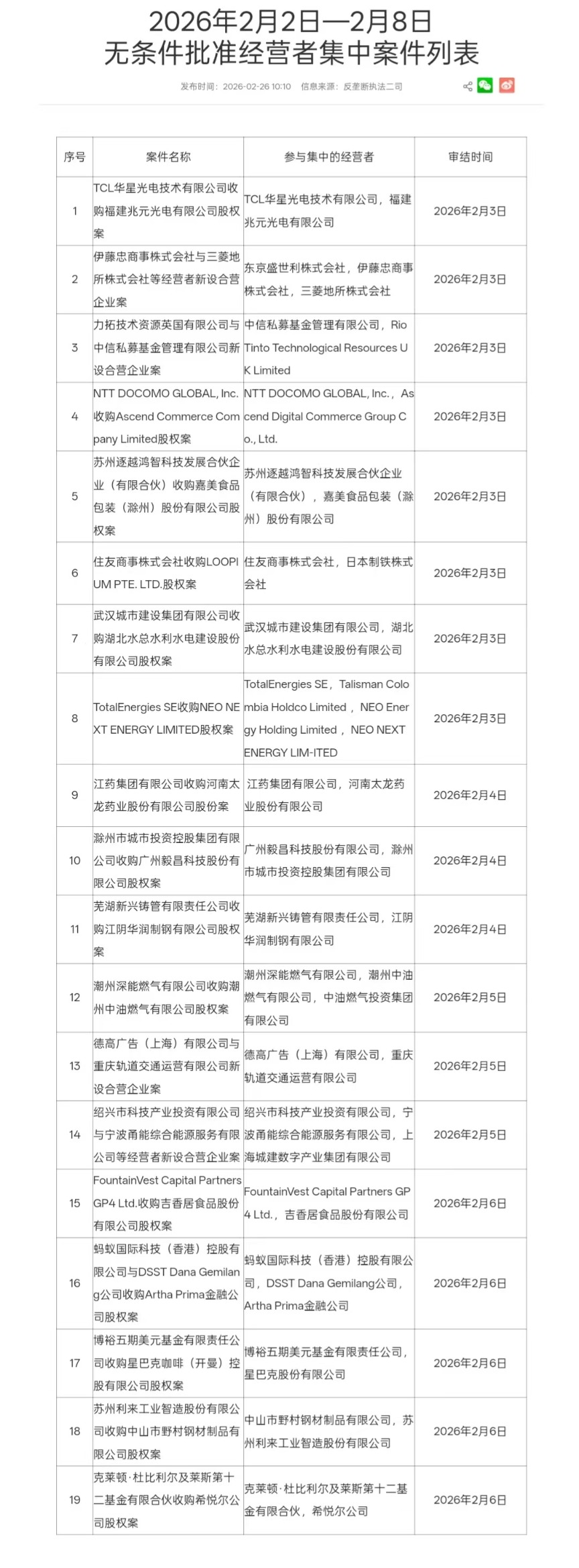 市场监管总局公布2026年2月2日—2月8日无条件批准经营者集中案件列表,其中包括TCL华星光电技术有限公司收购福建兆元光电有限公司股权案。