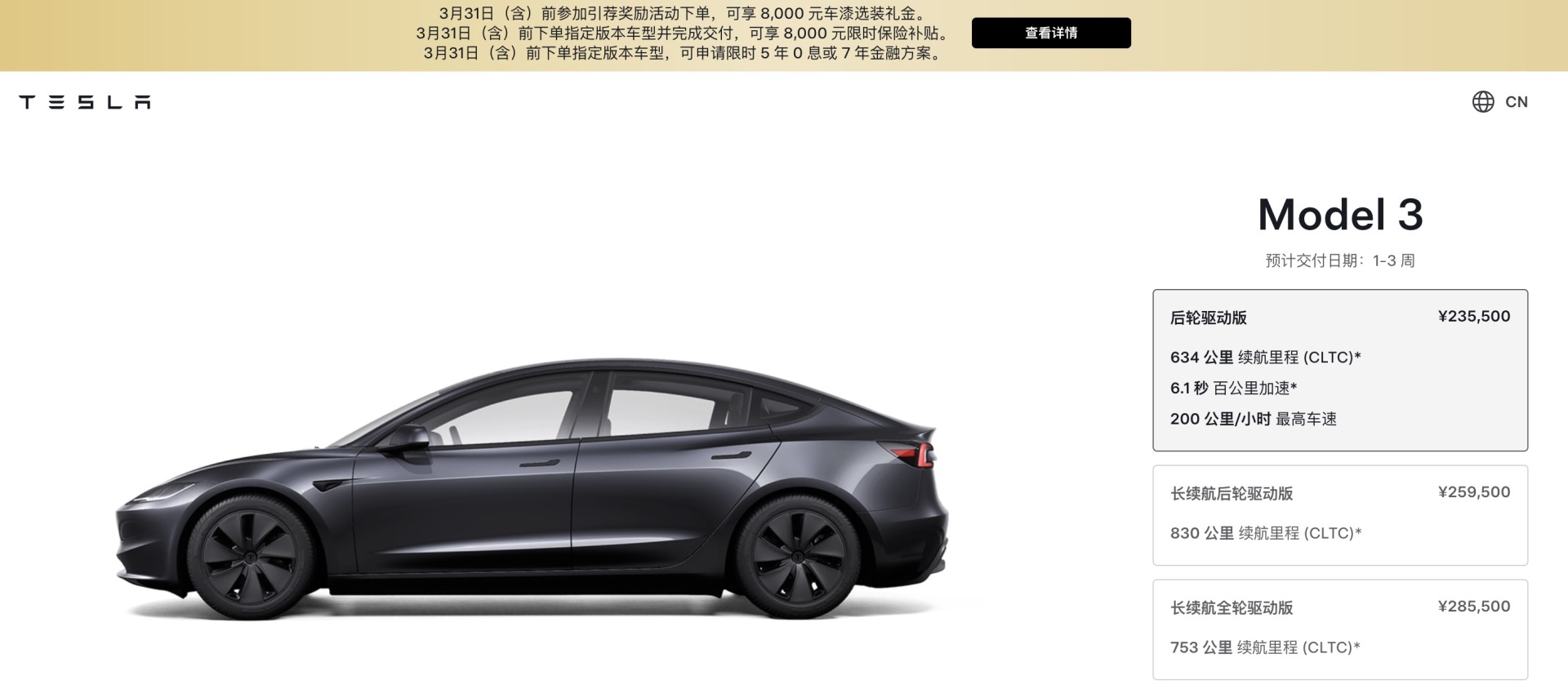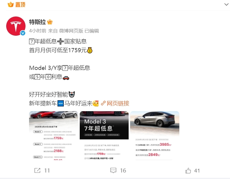 2月26日,特斯拉中国官宣,在3月31日前下单的用户,除Model 3高性能全轮驱动版外,Model 3与Model Y全系车型均可享受7年超低息与5年0息金融方案。