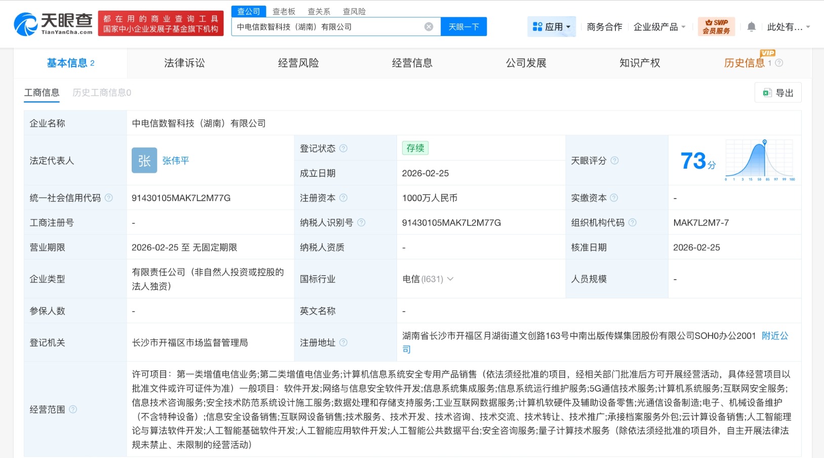 南方财经2月26日电,天眼查App显示,近日,中电信数智科技(湖南)有限公司成立,法定代表人为张伟平,注册资本1000万人民币,经营范围含第一类增值电信业务、第二类增值电信业务、计算机信息系统安全专用产品销售、软件开发、网络与信息安全软件开发、信息系统集成服务、信息系统运行维护服务、5G通信技术服务等,由中国电信旗下中电信数智科技有限公司全资持股。