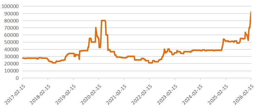 最后,委内瑞拉局势导致运费上涨,部分油轮被大型贸易商用于运输委内瑞拉原油,加剧了其他航线的运力紧张。与此同时,美国针对俄罗斯、伊朗等主要产油国的制裁持续收紧,导致大量原油被迫储存于海上浮舱。原油在油轮上的囤积规模不断扩大,延缓了船舶重新进入即期市场的周转速度,进而压缩了有效运力供给。Fearnleys数据显示,超大型原油运输船(VLCC)一年期日租金在2月18日当周涨至9.2万美元,同比增长78.6%,较去年年底攀升75.2%。