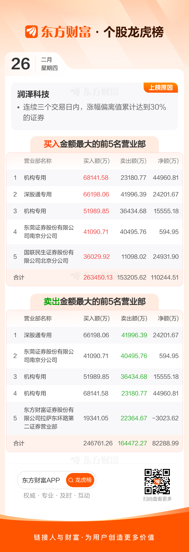 交易所2026年2月26日公布的交易公开信息显示,润泽科技因成为连续三个交易日内,涨幅偏离值累计达到30%的证券上榜。润泽科技当日收报102.17元,涨跌幅17.71%,换手率9.23%,成交额146.23亿。异常期间2月24日至2月26日,期间涨幅33.56%,累计偏离值31.06%,区间成交额327.21亿。