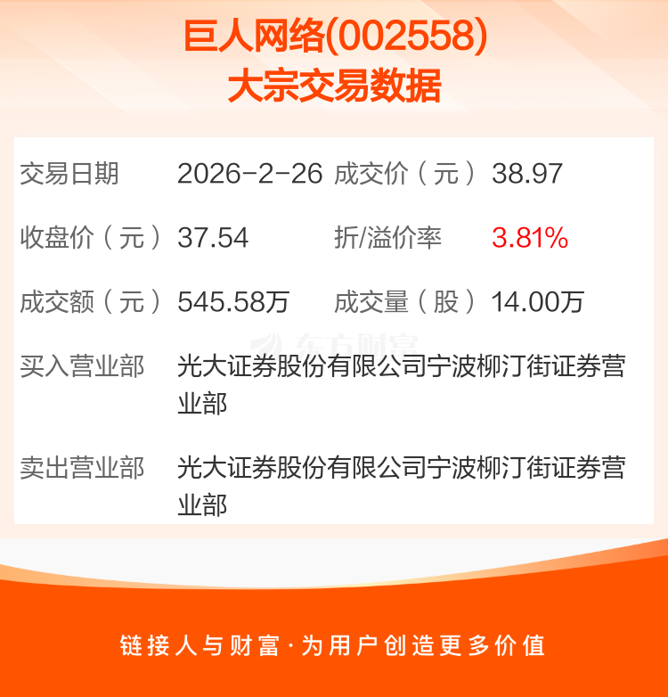 2026年2月26日,巨人网络发生1笔大宗交易,共成交14.00万股,成交金额545.58万元。