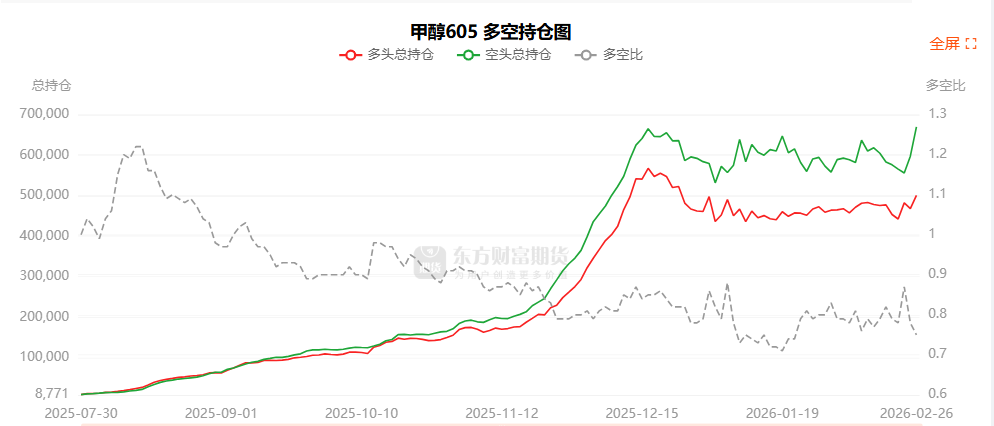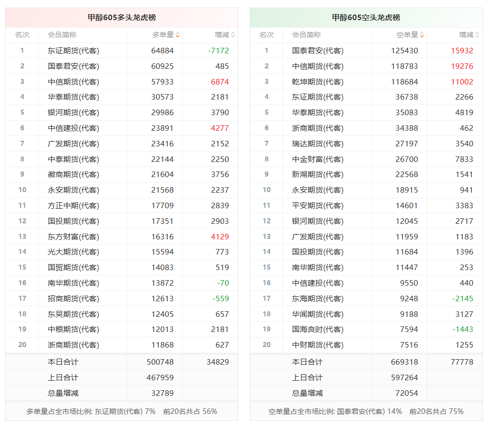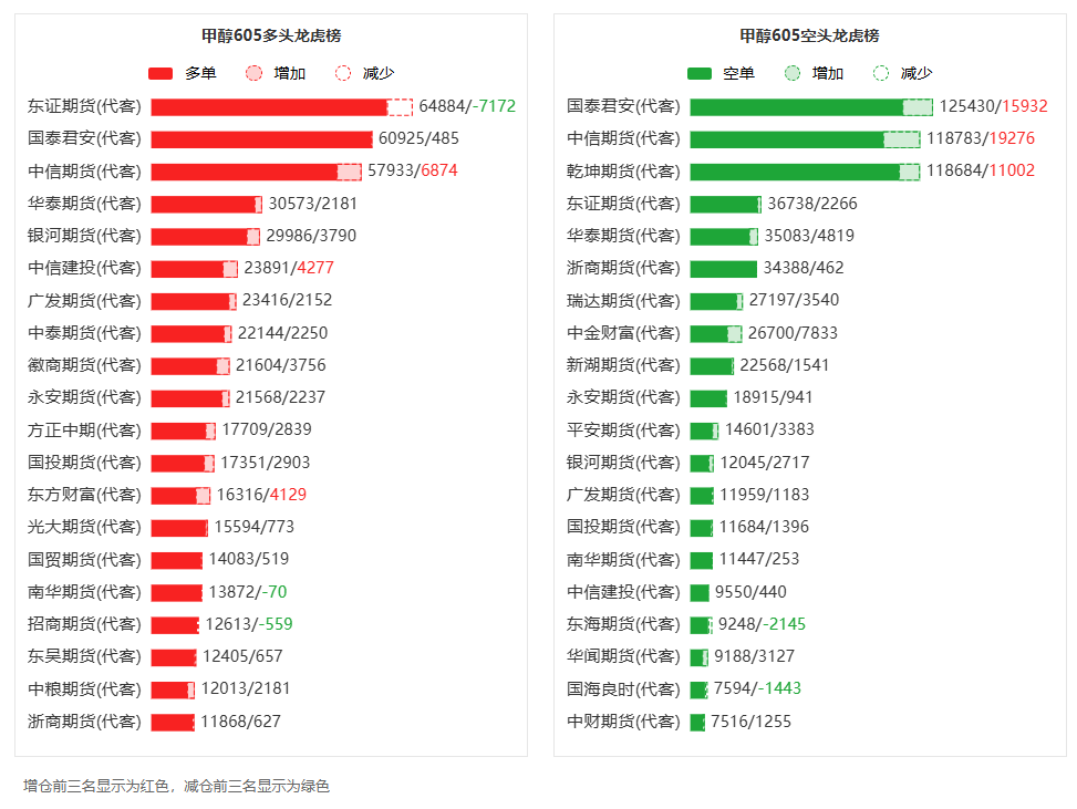 总体而言,甲醇605合约今日增仓下行,多空持仓排名前20席中,多空双方均呈进场态势,多头进场意愿弱于空头。