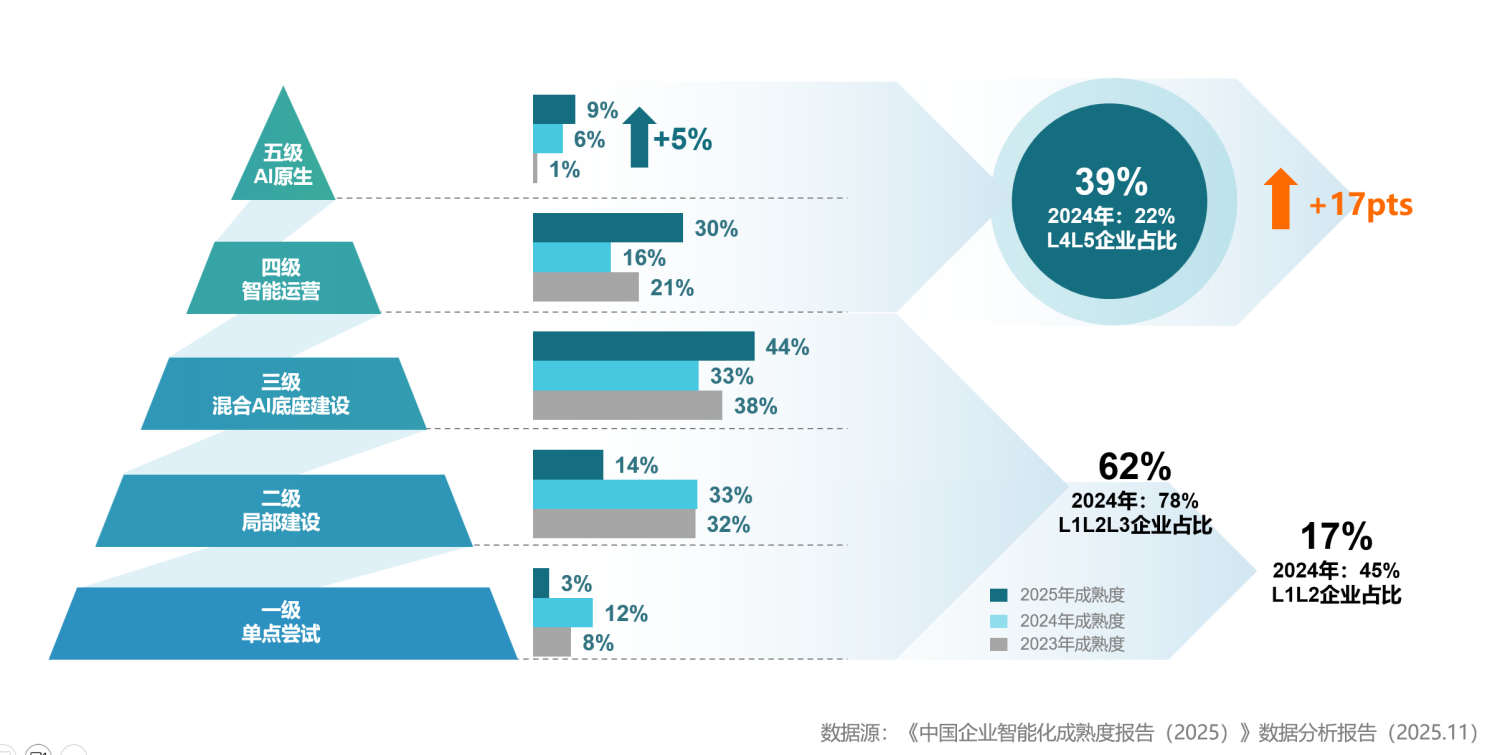 《报告》显示,2025年,智能化转型领先企业(四级-五级)占比大幅提升至39%(其中AI原生企业占比达9%),而2022年、2023年和2024年的占比分别是16%、22%和22%。《报告》特别提到,2025年是企业全面拥抱AI的分水岭之年,也是AI普惠真正被点燃的一年。