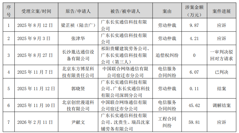 公告显示,本次诉讼源于长实通信与广东五方电力工程有限公司(简称“五方电力”)、中铁十一局集团有限公司(简称“中铁十一局”)的建设工程分包合同纠纷。