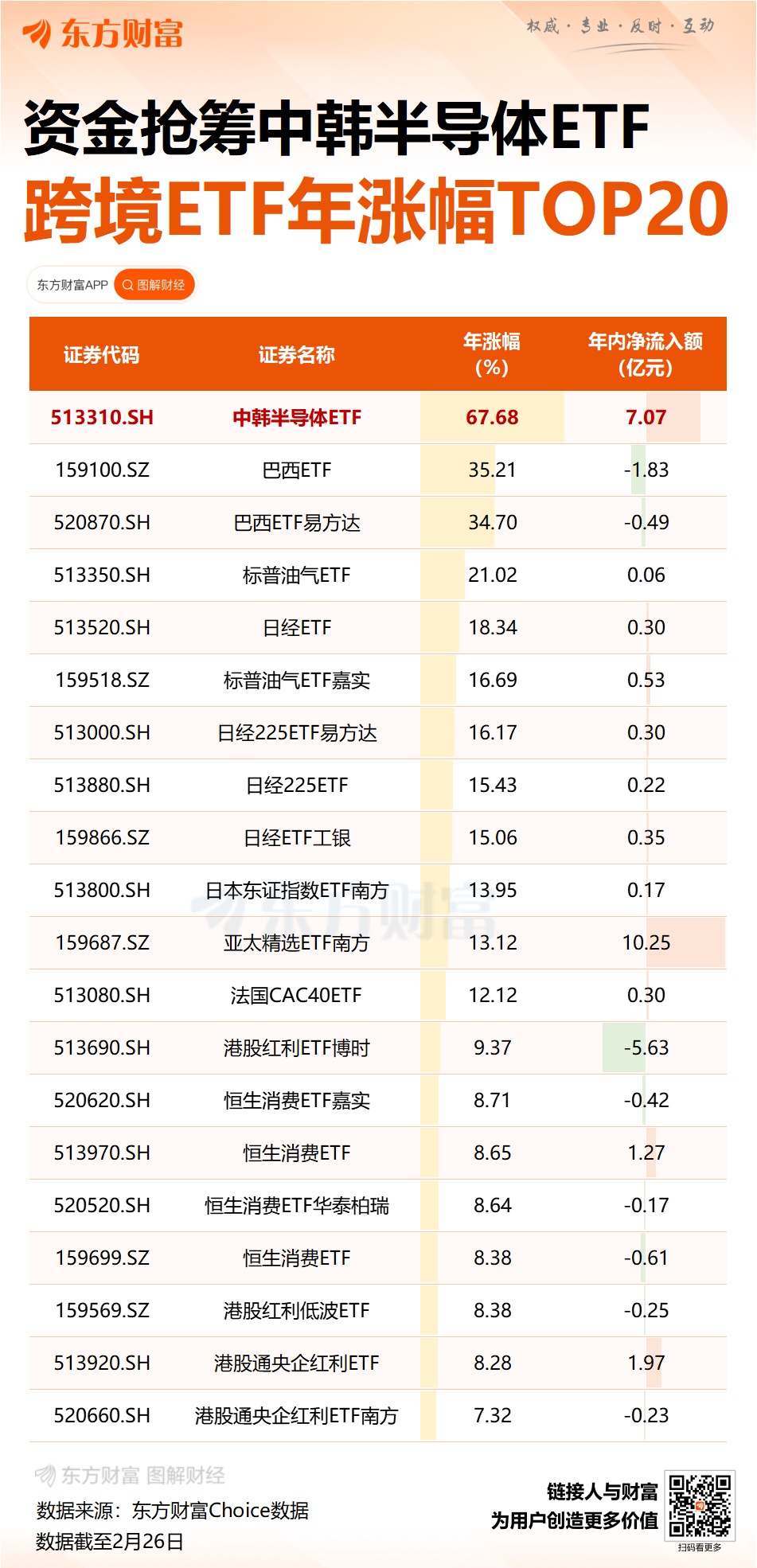 有关注韩国市场的基金经理透露,韩国市场由三星电子等半导体权重股领涨,凸显了股市表现与全球科技产业周期的紧密绑定,在科技芯片股领涨、宏观经济预期改善以及市场情绪高涨的共同作用下,追踪韩国股市的ETF也随之水涨船高。