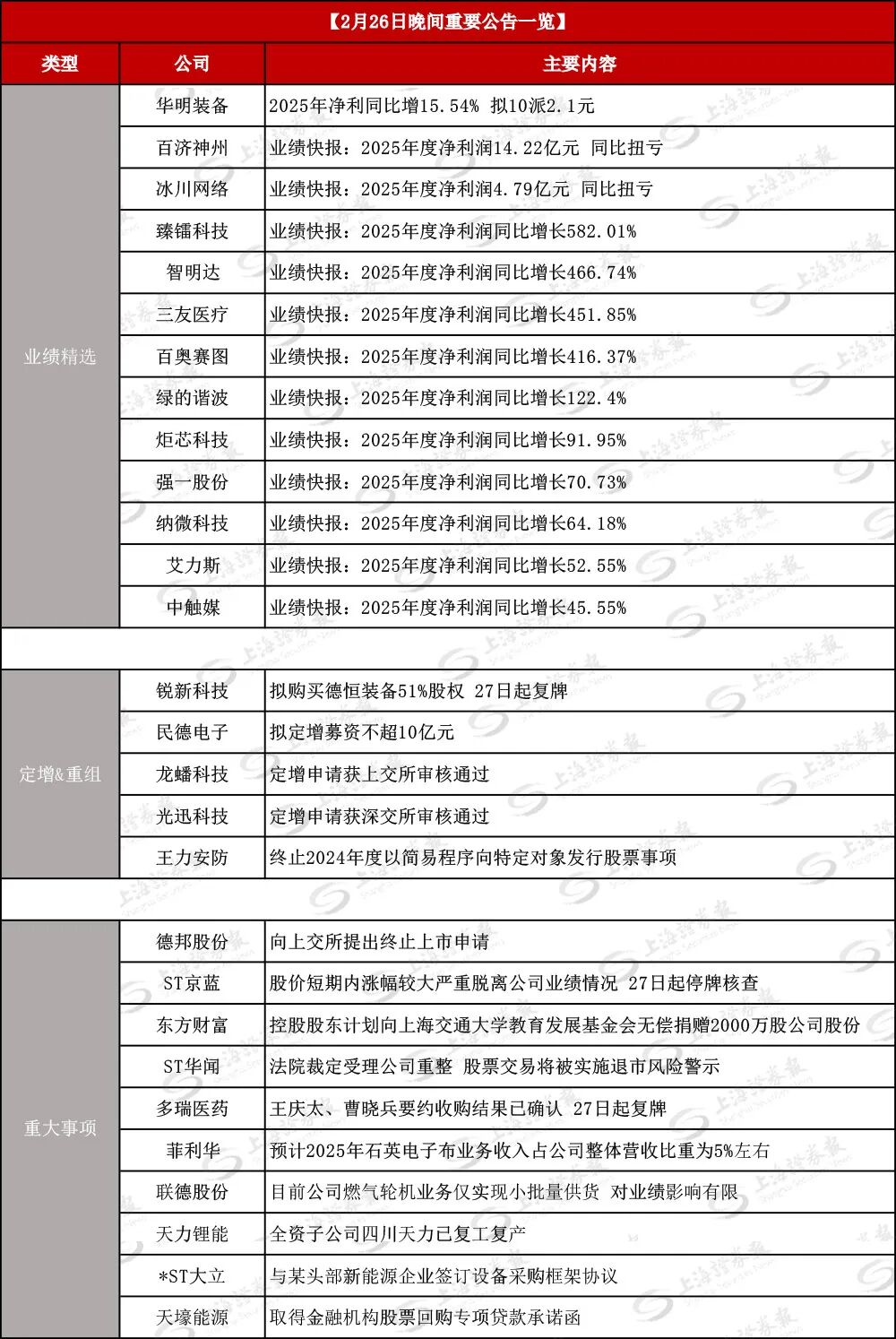 华明装备:披露年报。公司2025年实现营业收入24.27亿元,同比增长4.5%;实现归属于上市公司股东的净利润7.1亿元,同比增长15.54%;基本每股收益0.79元。公司2025年度利润分配预案为:向全体股东每10股派发现金红利2.1元(含税)。