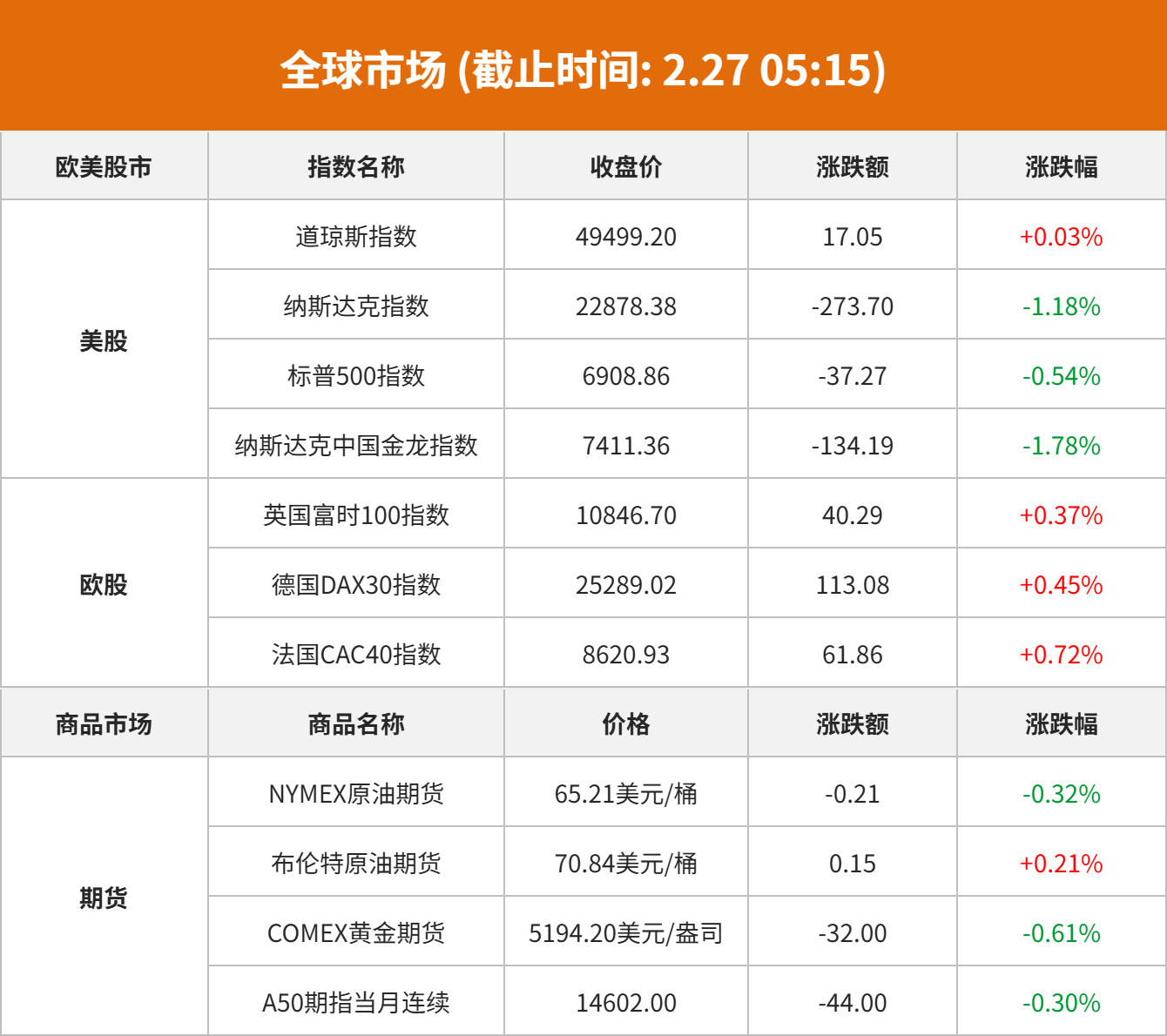 美股市场:美股三大指数02月26日收盘涨跌不一。截至收盘,道琼斯工业平均指数比前一交易日上涨17.05点,收于49499.2点,涨幅为0.03%;标准普尔500种股票指数下跌37.27点,收于6908.86点,跌幅为0.54%;纳斯达克综合指数下跌273.7点,收于22878.38点,跌幅为1.18%。