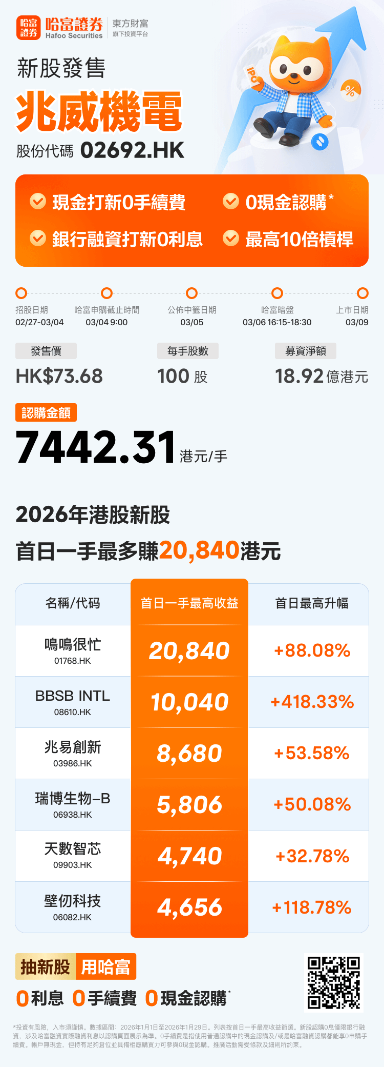 兆威机电(02692.HK)发布公告,于2月27日-3月4日招股,公司拟全球发售约2675万股股份,预期将于3月9日上市。