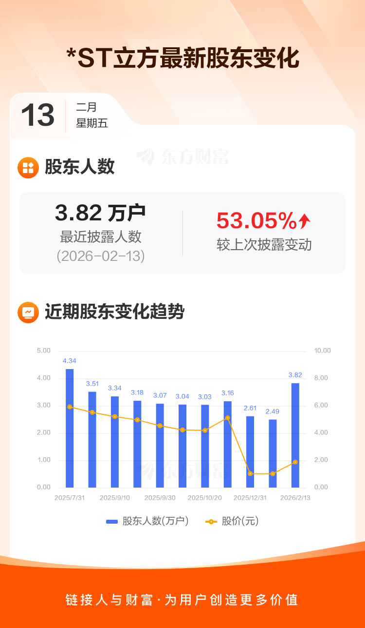 *ST立方最新披露数据显示,截至2月13日公司股东户数为3.82万户,较上期(2026年1月9日)增加1.32万户,增幅为53.05%。户均持有流通股数量由上期的2.57万股下降至1.68万股,户均持股金额由上期的2.59万元增加至3.13万元。