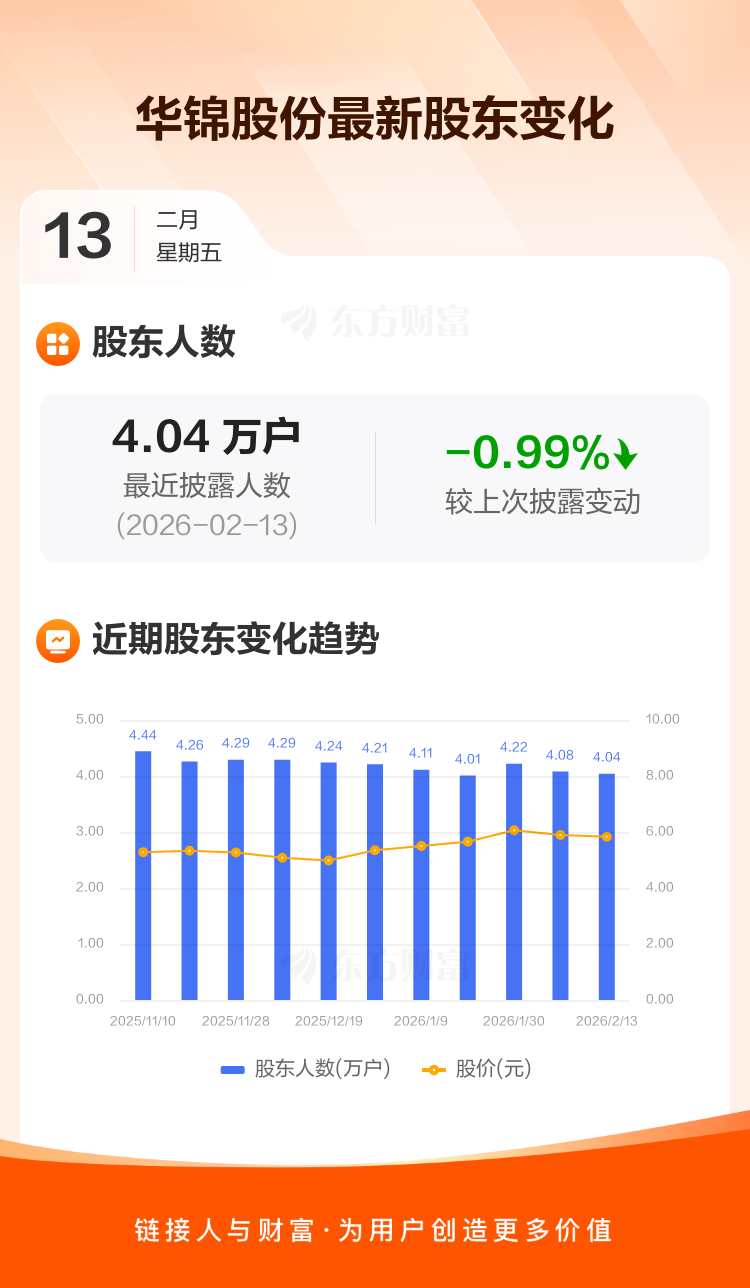 华锦股份最新披露数据显示,截至2月13日公司股东户数为4.04万户,较上期(2026年2月10日)减少405户,降幅为0.99%。户均持有流通股数量由上期的3.92万股上升至3.96万股,户均持股金额为23.08万元。