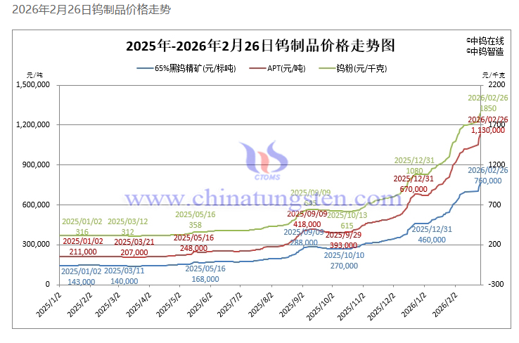 行业层面,钨价持续走高。据中钨在线数据统计,截至2月26日,钨粉价格报1850元/公斤,较年初涨71.3%。65%黑钨精矿价格报76万元/标吨,较年初涨65.2%。仲钨酸铵(APT)价格报113万元/吨,较年初涨68.7%。