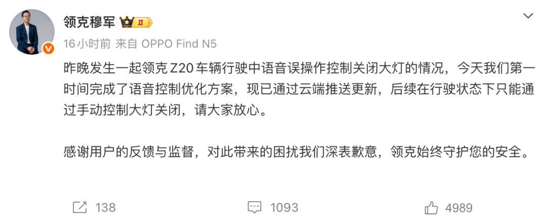 2月26日,领克汽车销售有限公司副总经理穆军发文,就“领克Z20车辆行驶中语音误操作控制关闭大灯的情况”致歉。