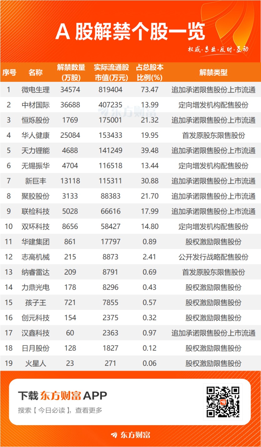 从解禁市值看,东方财富Choice数据显示,下周一面临解禁的19只股票中,微电生理、中材国际、恒烁股份解禁市值居前,解禁市值分别为81.94亿元、40.72亿元、17.50亿元。解禁比例方面,微电生理、天力锂能、新巨丰分别为73.47%、39.48%、30.88%,居于前列。