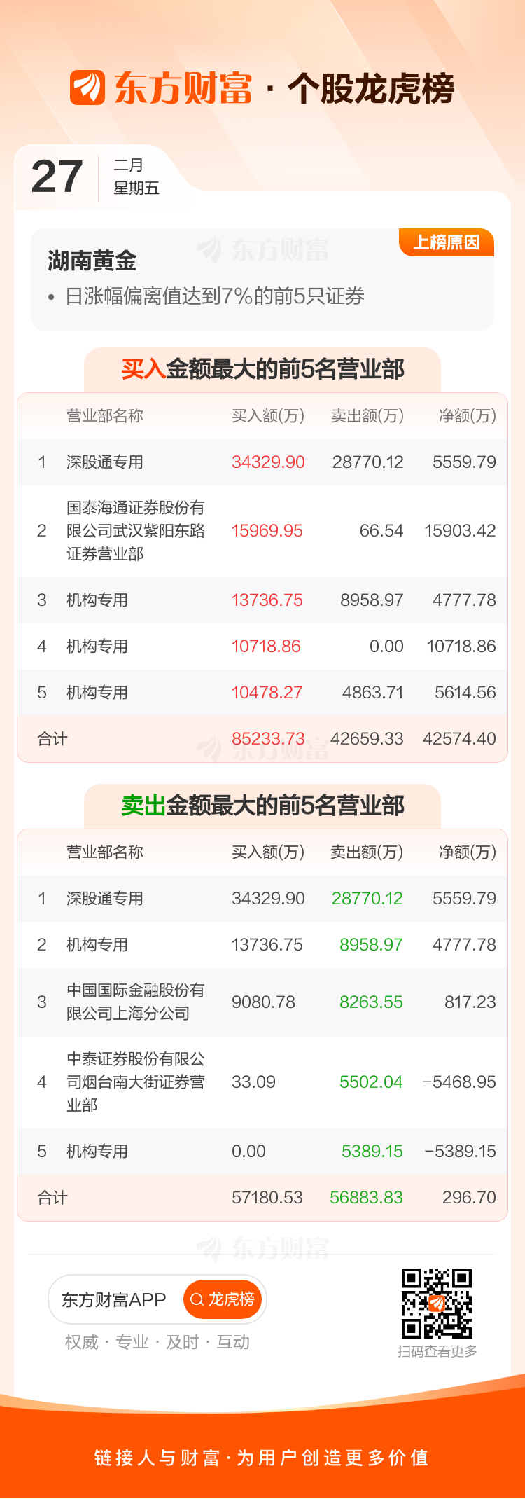 交易所2026年2月27日公布的交易公开信息显示,湖南黄金因成为日涨幅偏离值达到7%的前5只证券上榜。湖南黄金当日收报37.7元,涨跌幅10.01%,偏离值9.69%,换手率10.04%,成交额56.73亿。