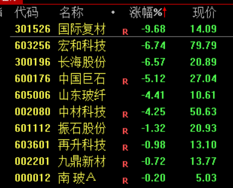 下跌方面,玻纤概念股下挫,国际复材跌近10%。