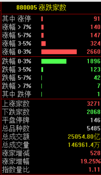 市场共3271只个股上涨,91只个股涨停,2068只个股下跌。