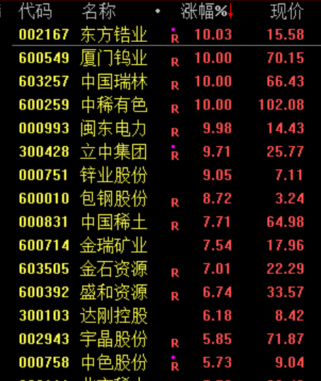 稀土永磁板块拉升,中稀有色涨停,包钢股份触及涨停。消息面上,金属镨钕价格上涨4万元/吨至108万元/吨,镨钕氧化物价格上涨5000元/吨至88.25万元/吨。
