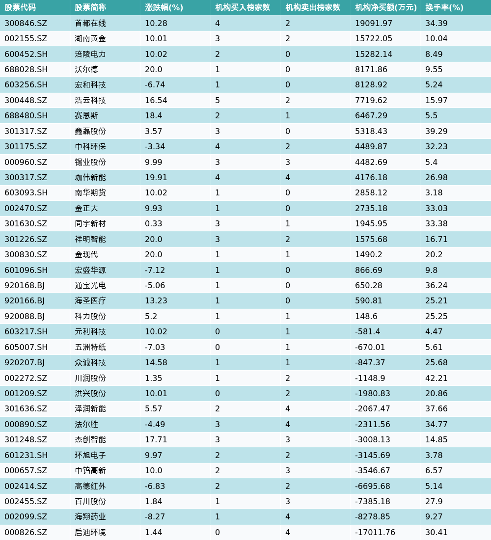 南财智讯2月27日电,盘后数据显示,因当日异动登上龙虎榜的个股中,34只沪深A股龙虎榜出现了机构的身影,机构合计净买入53233.03万元,具体来看,机构净买入20只个股,净卖出14只个股。其中,机构净买入前三分别为首都在线(300846.SZ)、湖南黄金(002155.SZ)与涪陵电力(600452.SH),详情见下图:机构净卖出的个股中,前三分别为启迪环境(000826.SZ)、海翔药业(002099.SZ)与百川股份(002455.SZ)。