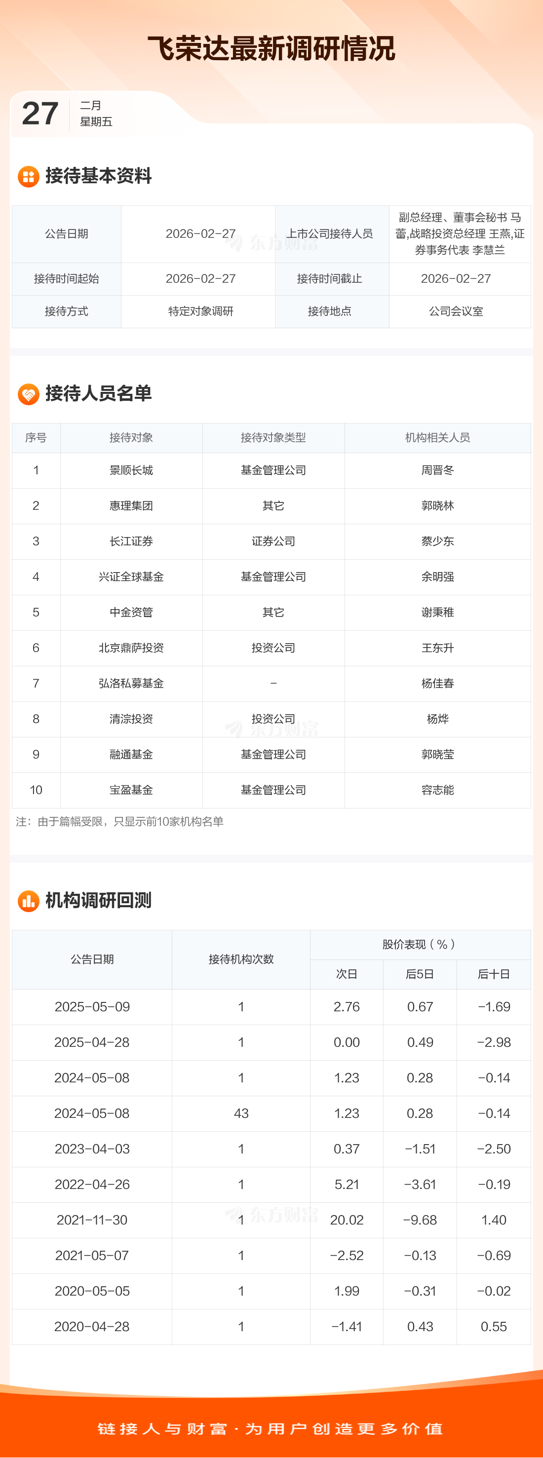 飞荣达2月27日公告称,2月27日接待景顺长城等15家机构调研。接待人员包括副总经理、董事会秘书 马蕾,战略投资总经理 王燕,证券事务代表 李慧兰。