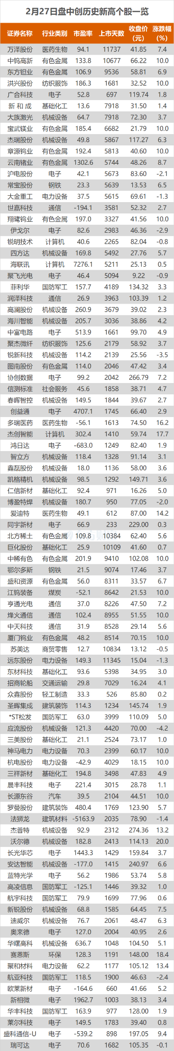2月27日,A股三大指数今日涨跌不一,截止收盘,沪指涨0.39%,收报4162.88点;深证成指跌0.06%,收报14495.09点;创业板指跌1.04%,收报3310.30点。东方财富Choice数据显示,今日有89只个股盘中股价创历史新高,分别为章源钨业、云南锗业等。