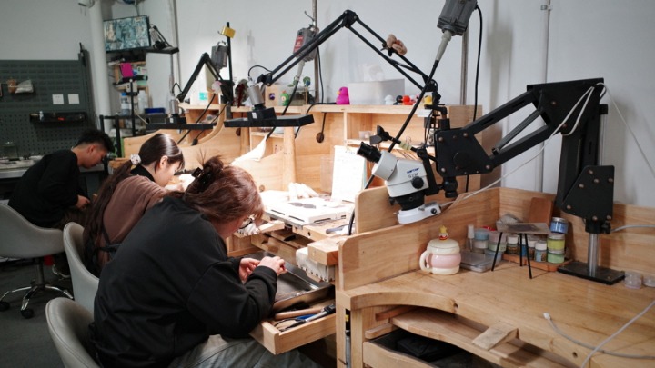 从拥挤的豫园打金店走入位于申报馆五楼的“周末打金”,空间一下子开阔疏朗起来。约130平方米的工作室是当下年轻人喜欢的原木风装修风格,销售人员会带顾客坐在沙发区,翻看平板电脑了解式样和工费。每个打金师傅都有自己专属的木质工作台,开着高级护眼灯作业,台面上除了琳琅满目的工具,还有空间摆下绿植、小手办等私人物件。