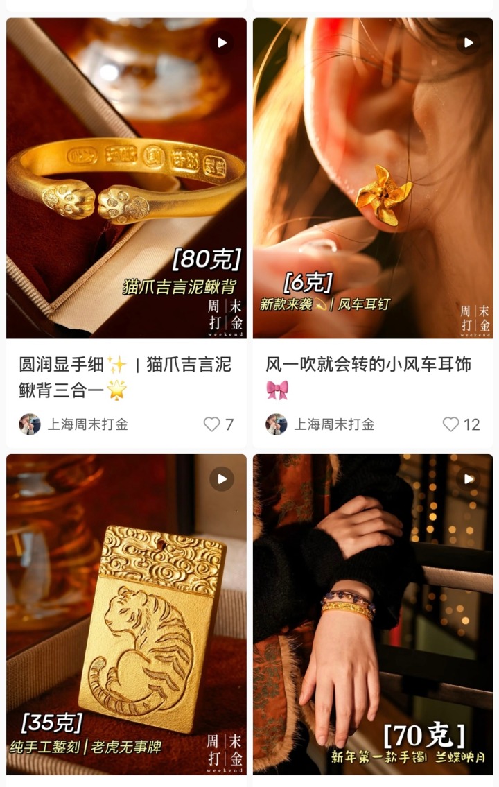 身居写字楼,顾客几乎全部来自线上,且需要提前预约。在小红书上,“周末打金”有3.4万粉丝,李晶很看重店铺的网络运营和口碑,会定期发布新品视频和出镜介绍,一个月更新30款打底的黄金首饰,“不能永远靠大数据,必须源源不断输出新的东西,才能满足客人的需求。”当天,她戴的一对腰果金耳环是店里的热销款。除了自主研发,也有顾客来定制一些特色款式,有人复刻游戏《黄金矿工》道具,有人定制孙悟空的金箍棒,还有融入复古情结的黄金“顶针”等,这些特殊定制的制作过程都做成网络短视频发布,为店铺增加流量。