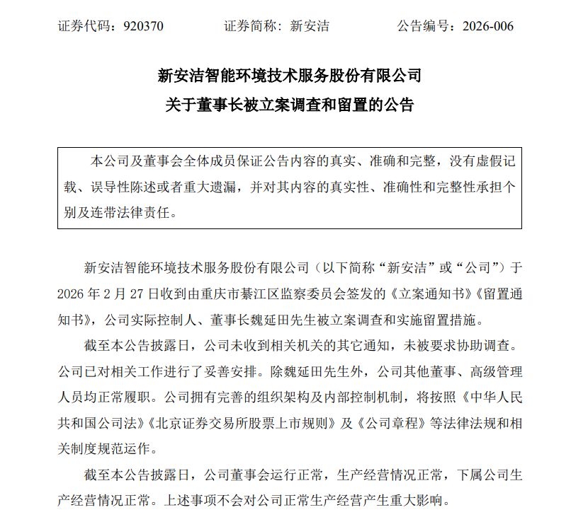 新安洁表示,目前,公司未收到相关机关的其他通知,未被要求协助调查,并且尚未知悉立案调查及留置的进展及结论。新安洁已对相关工作进行妥善安排。除魏延田外,公司其他董事、高级管理人员均正常履职。
