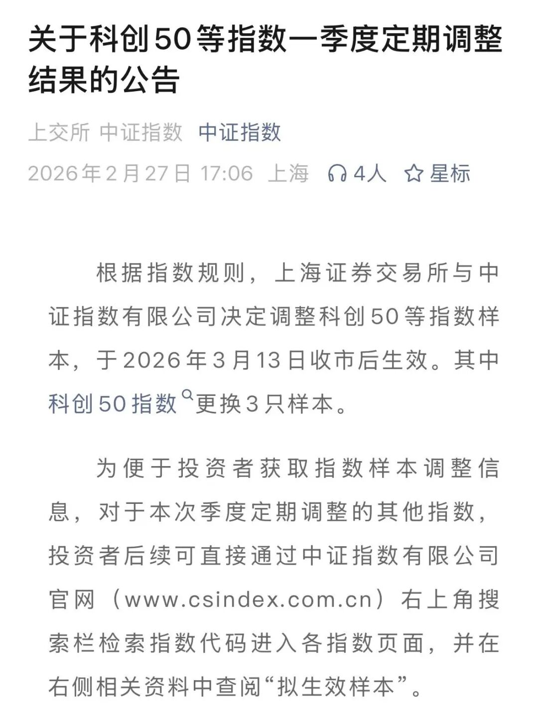 2月27日晚,上交所和中证指数有限公司联合发布公告称,根据指数规则,上交所与中证指数有限公司决定调整科创50等指数样本,于3月13日收市后生效。