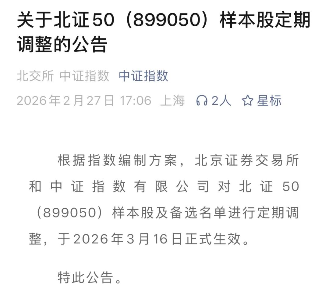 除科创板相关指数外,27日晚间,北交所和中证指数有限公司公告称,根据指数编制方案,双方对北证50指数样本股及备选名单进行定期调整,将于3月16日正式生效。