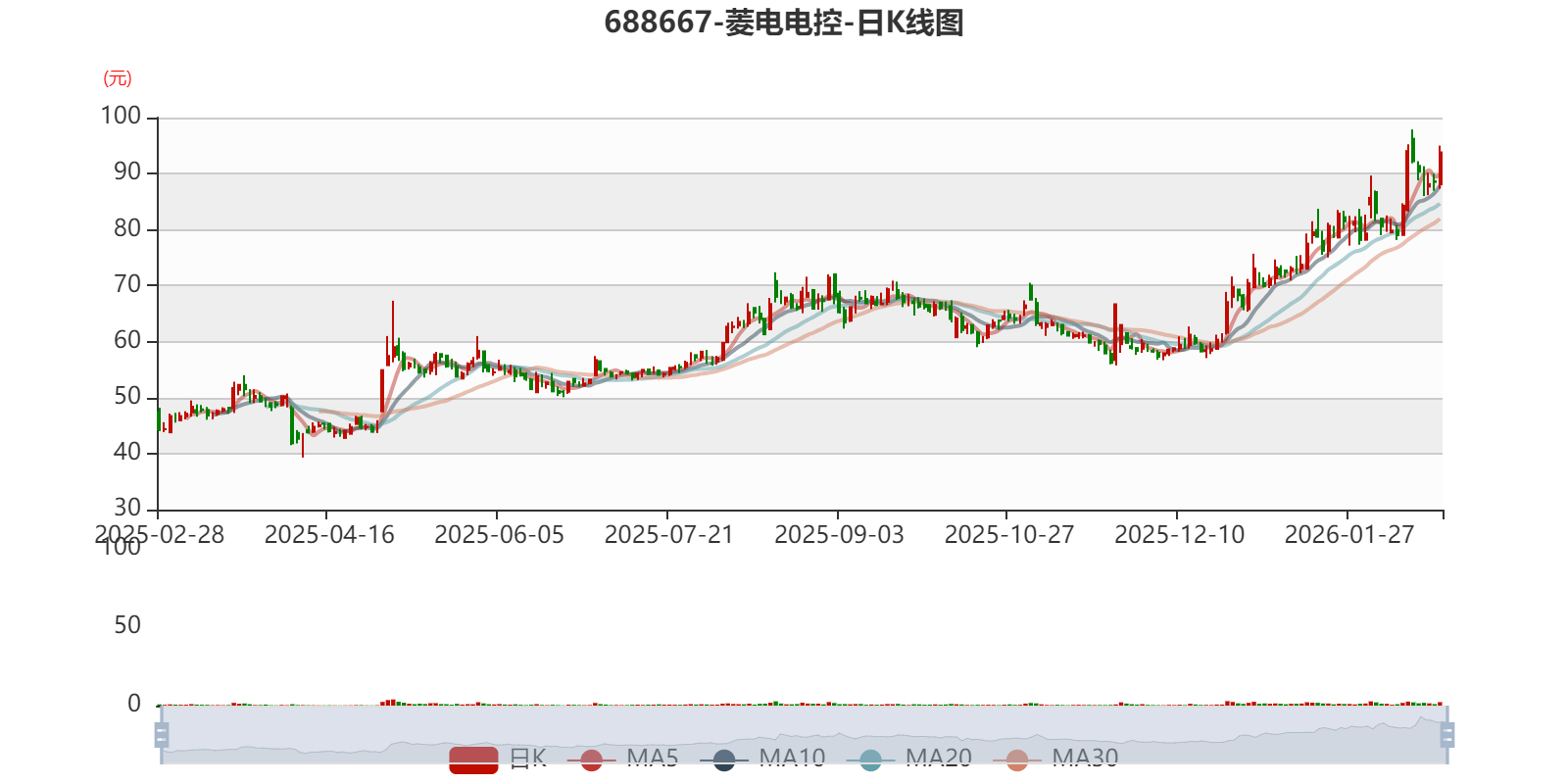 中证智能财讯菱电电控(688667)2月27日晚间披露2025年业绩快报,公司实现营业收入11.94亿元,同比下降0.17%;归母净利润1.35亿元,同比增长745.02%;扣非净利润1.13亿元,同比增长1602.73%;基本每股收益2.59元,加权平均净资产收益率为7.96%。以2月27日收盘价计算,菱电电控目前市盈率(TTM)约为36.68倍,市净率(LF)约2.85倍,市销率(TTM)约3.94倍。
