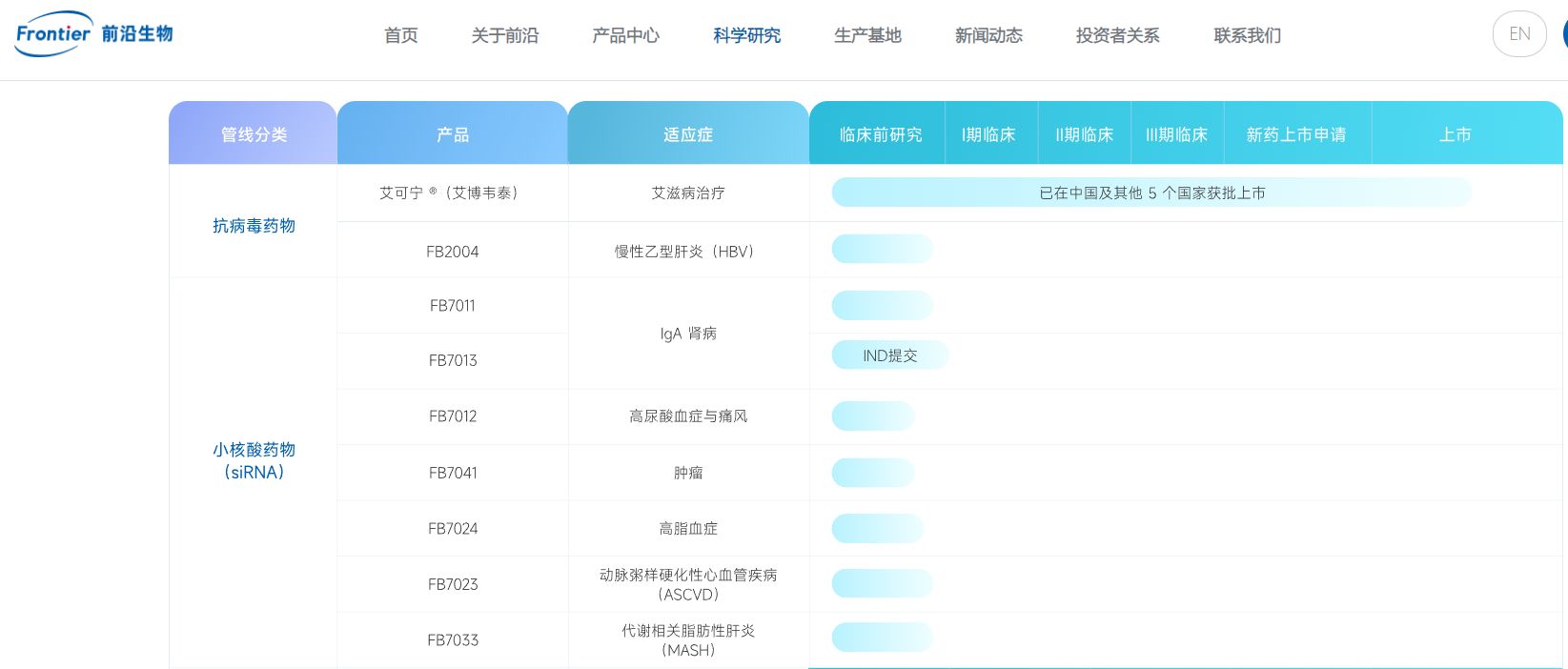 前沿生物方面并未在公告中详细披露上述两款小核酸产品的靶点、适应证等信息。根据公司官网披露的研发管线进展,前沿生物目前共有7款小核酸药物产品在研,治疗领域涵盖肝炎、高尿酸血症与痛风、肿瘤、高脂血症等。其中提交IND的仅有一款代号为FB7013的产品,适应证为IgA肾病。
