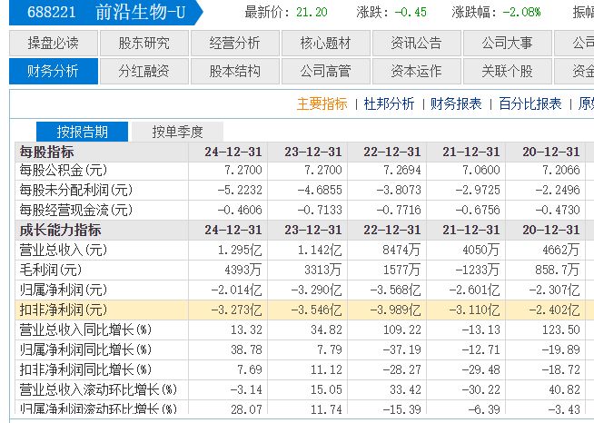 股价“过山车”的背后,还有前沿生物的基本面现状。曾被一些媒体称为“抗艾第一股”的前沿生物,自2020年10月登陆科创板以来,始终未能实现盈利。财务数据显示,2020年至2024年,公司的扣非净利润持续亏损,累计亏损金额超过16亿元。