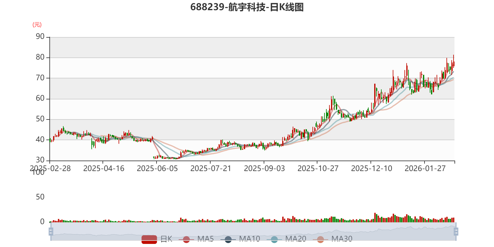 中证智能财讯航宇科技(688239)2月27日晚间披露2025年业绩快报,公司实现营业收入20.34亿元,同比增长12.64%;归母净利润1.86亿元,同比下降1.44%;扣非净利润1.72亿元,同比下降0.27%;基本每股收益0.98元,加权平均净资产收益率为9.76%。以2月27日收盘价计算,航宇科技目前市盈率(TTM)约为79.95倍,市净率(LF)约7.55倍,市销率(TTM)约7.78倍。