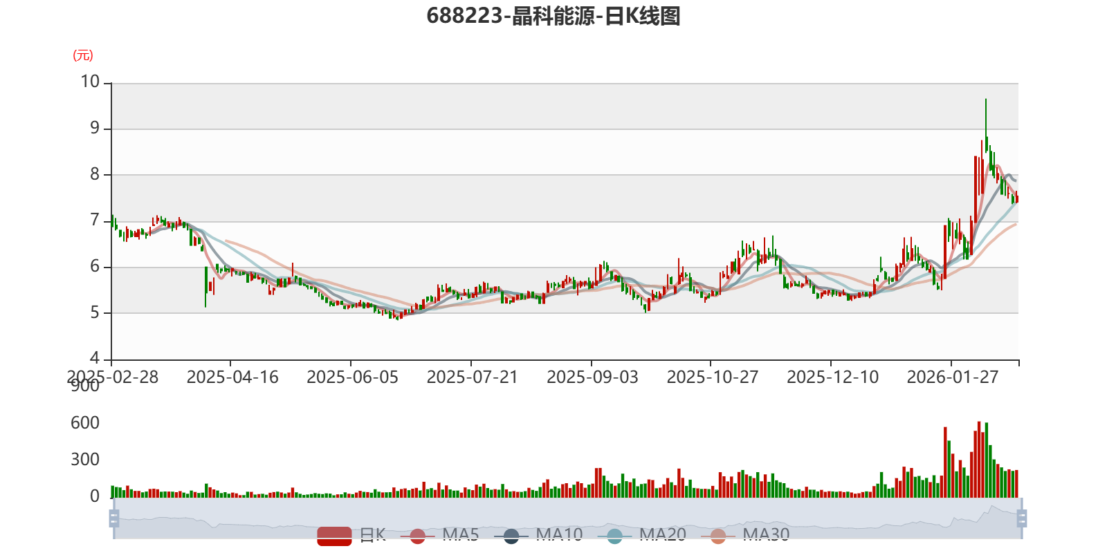 中证智能财讯晶科能源(688223)2月27日晚间披露2025年业绩快报,公司实现营业收入654.92亿元,同比下降29.18%;归母净利润亏损67.86亿元,上年同期盈利9892.76万元;扣非净利润亏损76.43亿元,上年同期亏损9.32亿元;基本每股收益-0.68元,加权平均净资产收益率为-23.49%。以最新收盘价计算,市净率(LF)约2.76倍,市销率(TTM)约1.1倍。