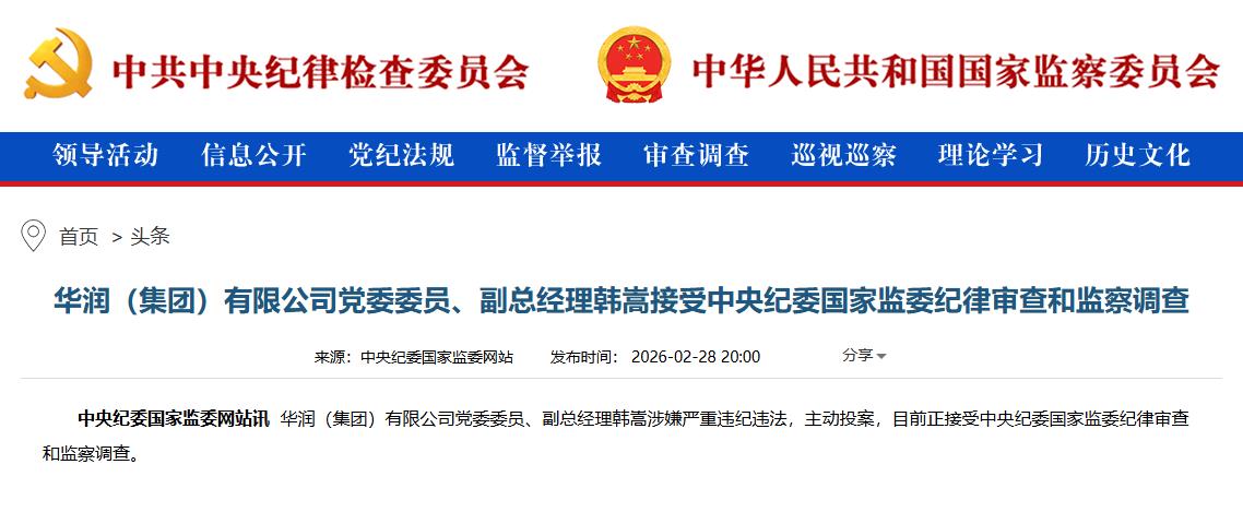 华润(集团)有限公司党委委员、副总经理韩嵩涉嫌严重违纪违法,主动投案,目前正接受中央纪委国家监委纪律审查和监察调查。