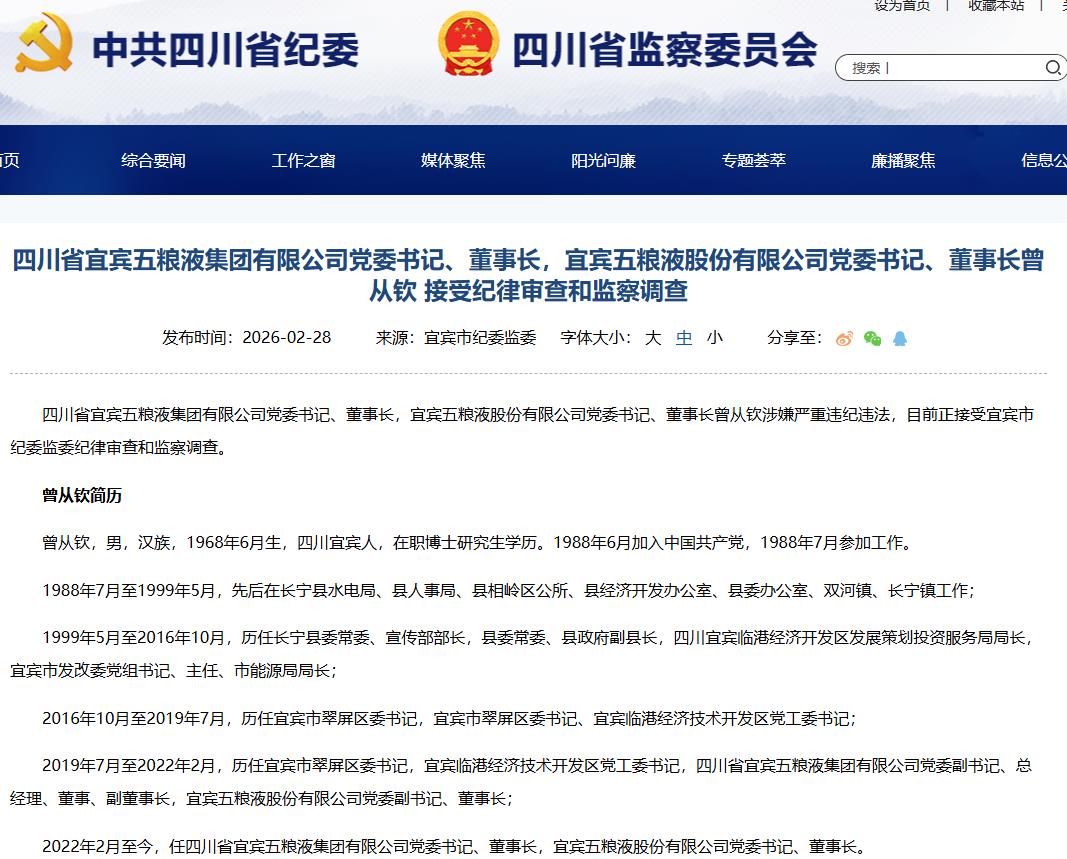 四川省宜宾五粮液集团有限公司党委书记、董事长,宜宾五粮液股份有限公司党委书记、董事长曾从钦涉嫌严重违纪违法,目前正接受宜宾市纪委监委纪律审查和监察调查。
