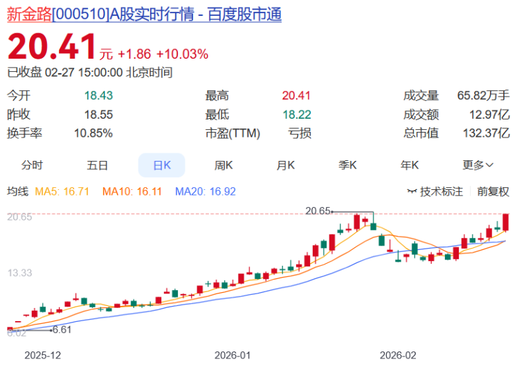 新金路报收20.41元,日涨幅10.03%(涨停),换手率10.85%,周涨幅20.06%,列第三,今年以来涨幅76.25%。