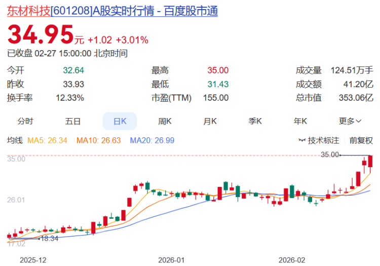 东材科技报收34.95元,日涨幅3.01%,换手率12.33%,周涨幅25.99%,今年以来涨幅29.49%。