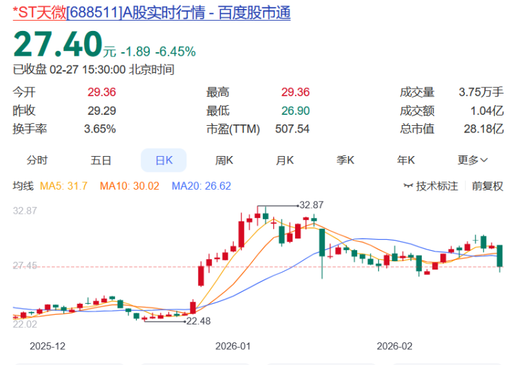 *ST天微报收27.40元,日涨幅-6.45%,换手率3.65%,周涨幅-6.96%,今年以来涨幅-4.50%。