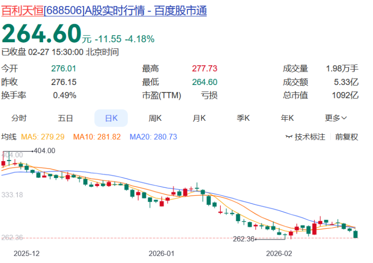 百利天恒报收264.60元,日涨幅-4.18%,换手率0.49%,周涨幅-7.80%,今年以来涨幅-18.11%。