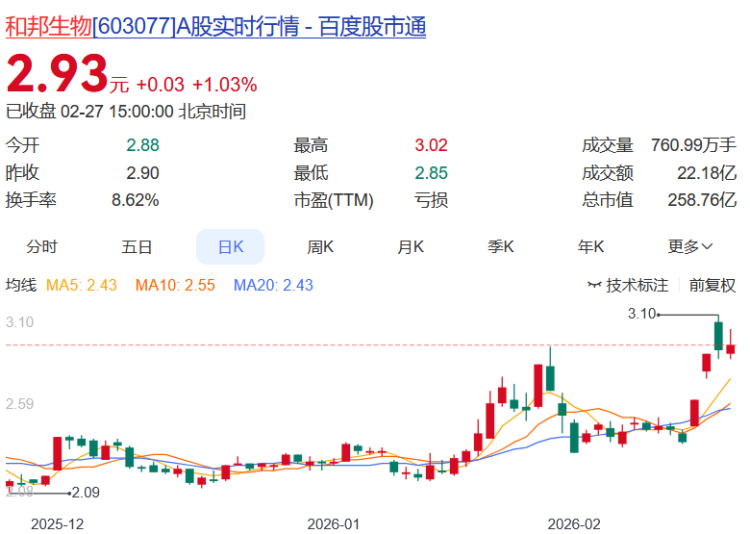 和邦生物报收2.93元,日涨幅1.03%,换手率8.62%,周涨幅23.11%,今年以来涨幅29.65%。
