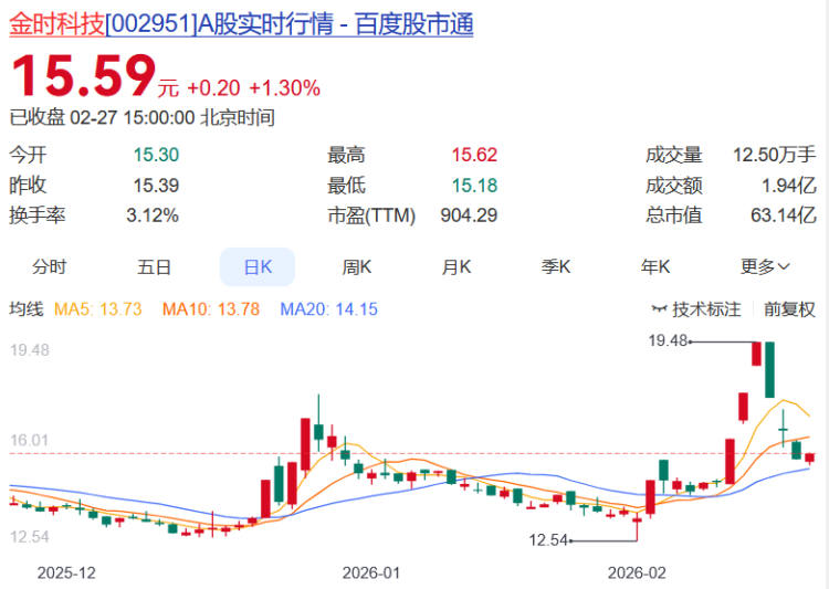 金时科技报收15.59元,日涨幅1.30%,换手率3.12%,周涨幅-19.97%,今年以来涨幅4.63%。