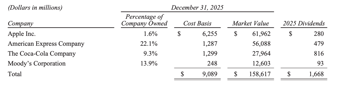 此外,伯克希尔的财报还显示,截至2025年12月31日,其权益投资的总公允价值65%集中在美国运通、苹果、美国银行、可口可乐公司和雪佛龙。