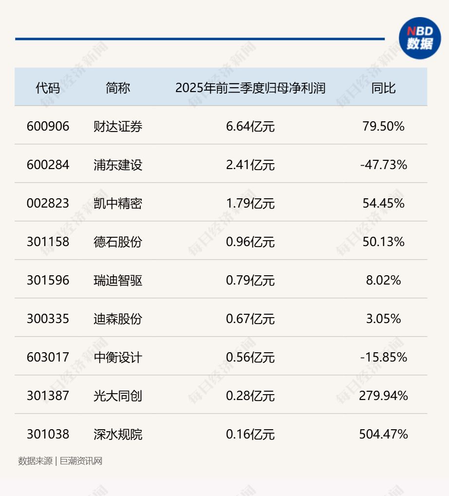 其余9家暂未披露2025全年业绩的公司,经营表现也呈现分化特征。财达证券、浦东建设和凯中精密3家公司2025年前三季度归母净利润均突破1亿元,其中财达证券2025年前三季度盈利6.64亿元,同比增长79.5%,业绩表现优异。而浦东建设同期归母净利润2.41亿元,同比下降47.73%,在9家公司中业绩下滑最为显著。另外6家公司前三季度均实现盈利,但盈利规模相对偏小,归母净利润均在1亿元以下,其中深水规院以1580.9万元的归母净利润居末位,却凭借504.47%的同比大幅增长,成为为数不多的业绩高增企业。