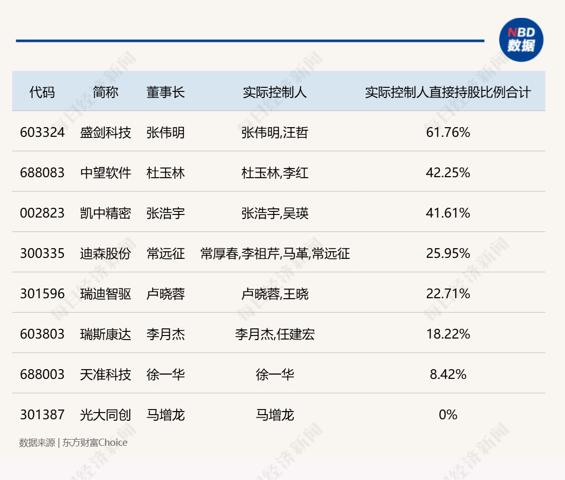 其次,股权结构层面,有8家公司的董事长兼总经理,同时是公司的控股股东、实际控制人或实控人之一,占比约42%。