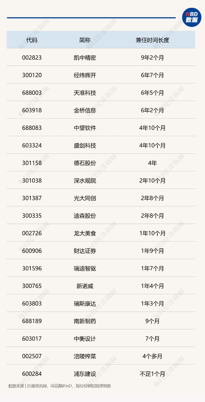 考虑到部分公司在上市前已存在“一肩挑”情况,为确保统计准确性,《每日经济新闻》记者统一以公司上市时间为统计起点。结果显示,浦东建设、涪陵榨菜、中衡设计、南新制药4家公司两职兼任时间在1年以内,瑞斯康达、深水规院等8家公司兼任时间则在1-3年之间,凯中精密、经纬辉开等7家公司兼任时间则超过3年。各家公司兼任时长从不足1个月到超9年,跨度悬殊。
