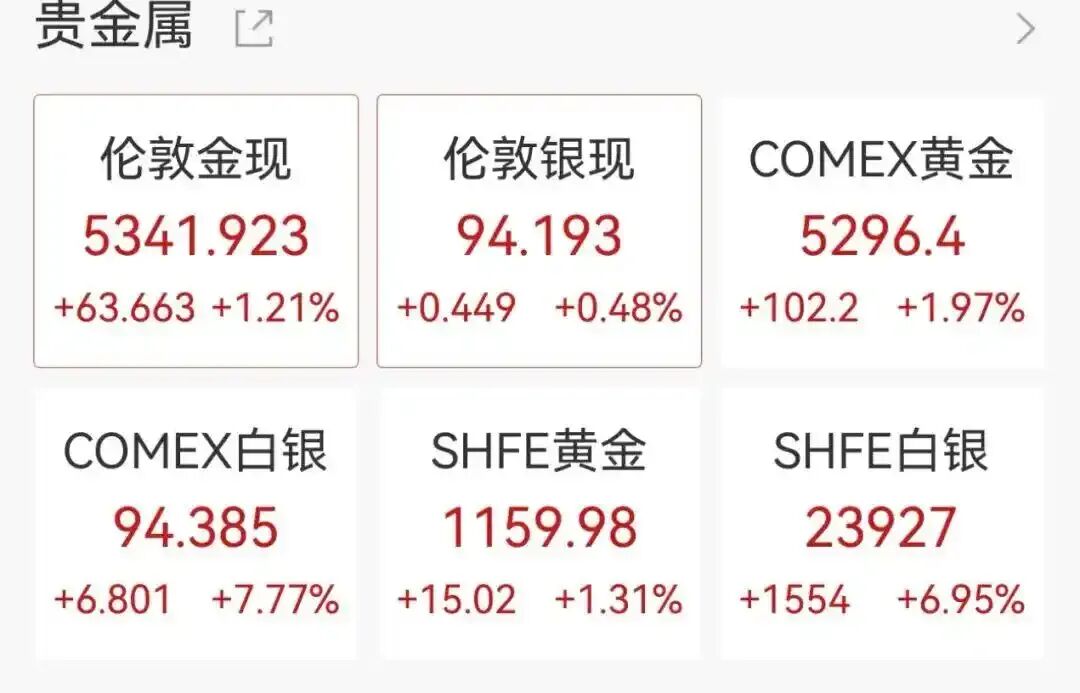 截至发稿,涨幅有所收窄,现货黄金上涨至5341美元/盎司,涨幅1.21%;现货白银报94美元/盎司,涨幅0.48%。COMEX黄金涨1.97%,COMEX白银涨7.77%。