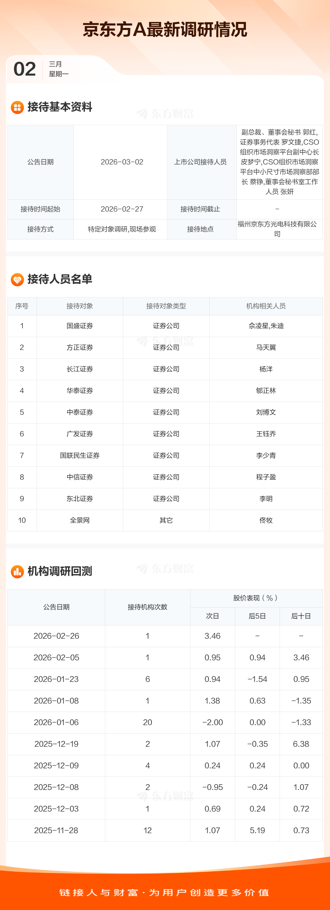 京东方A3月2日公告称,2月27日接待国盛证券等10家机构调研。接待人员包括副总裁、董事会秘书 郭红,证券事务代表 罗文捷,CSO组织市场洞察平台副中心长 皮梦宁,CSO组织市场洞察平台中小尺寸市场洞察部部长 蔡铮,董事会秘书室工作人员 张妍。